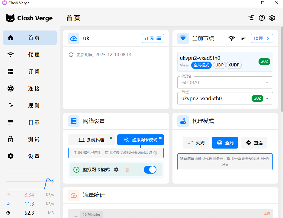 先下载Clash Verge这款工具,导入你的优质节点,开启虚拟虚拟网卡、TUN、全局模式。
