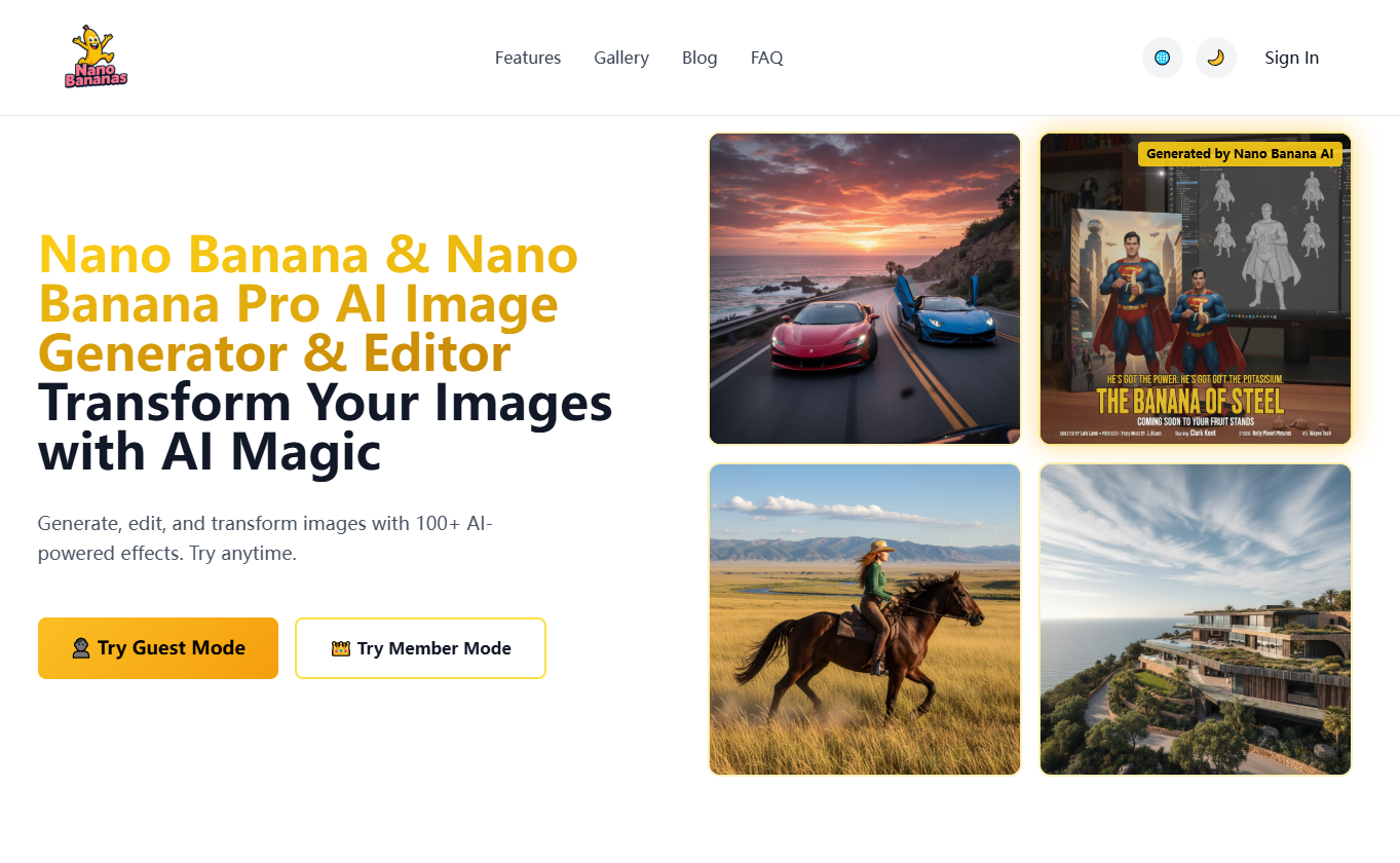 在众多 AI 图像平台中,简洁易用的工具反而变得稀缺。许多平台功能繁复、界面拥挤、参数过多,让初学者和内容创作者难以快速上手。最近,一个名为 Nano Bananas(nanobananas.cc) 的小型网站进入了视野,它以“轻量、干净、开箱即用”为核心特点,为图像生成与编辑提供了非常直接的体验。